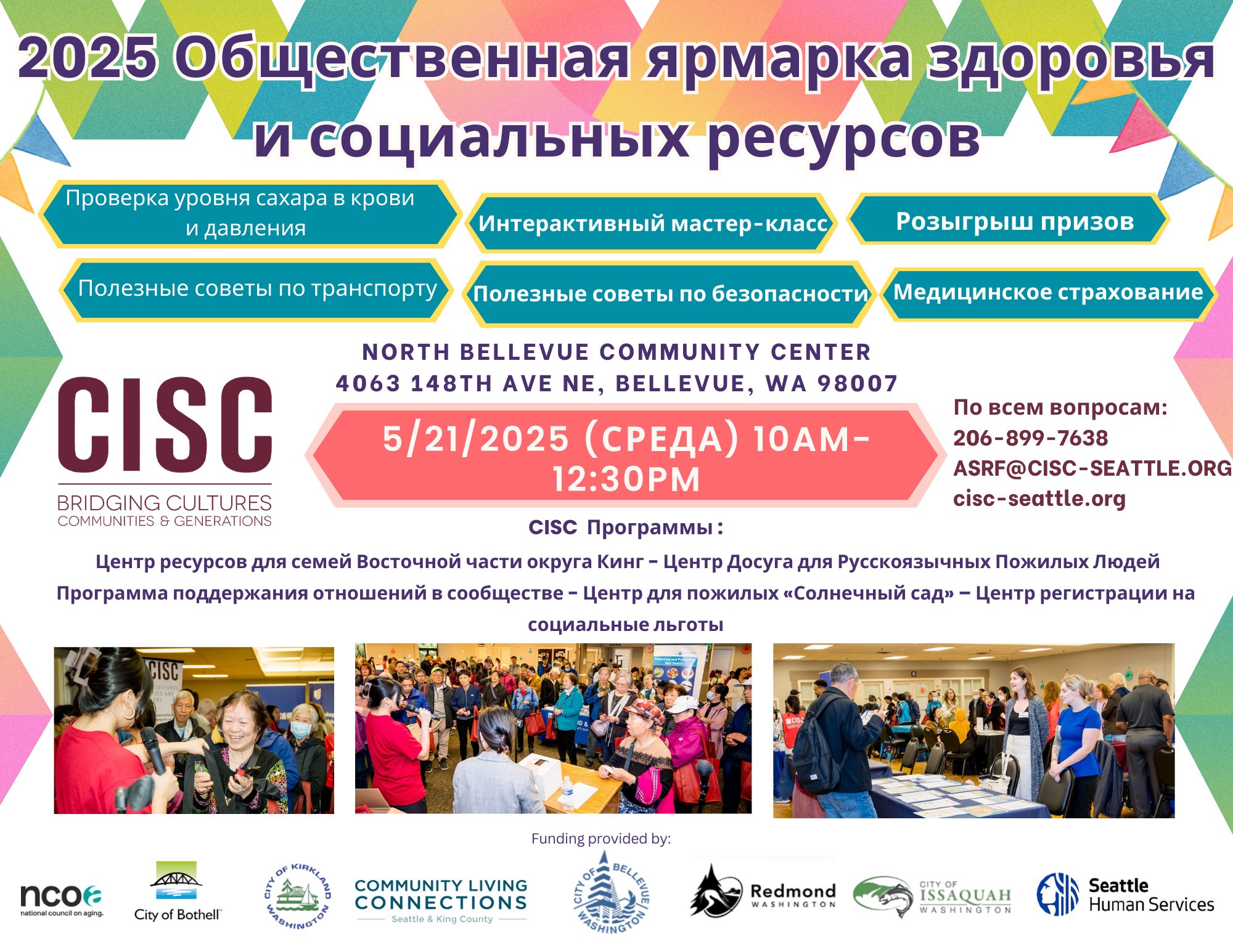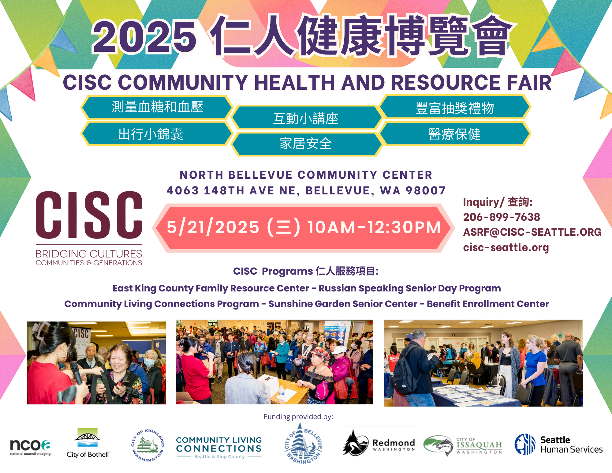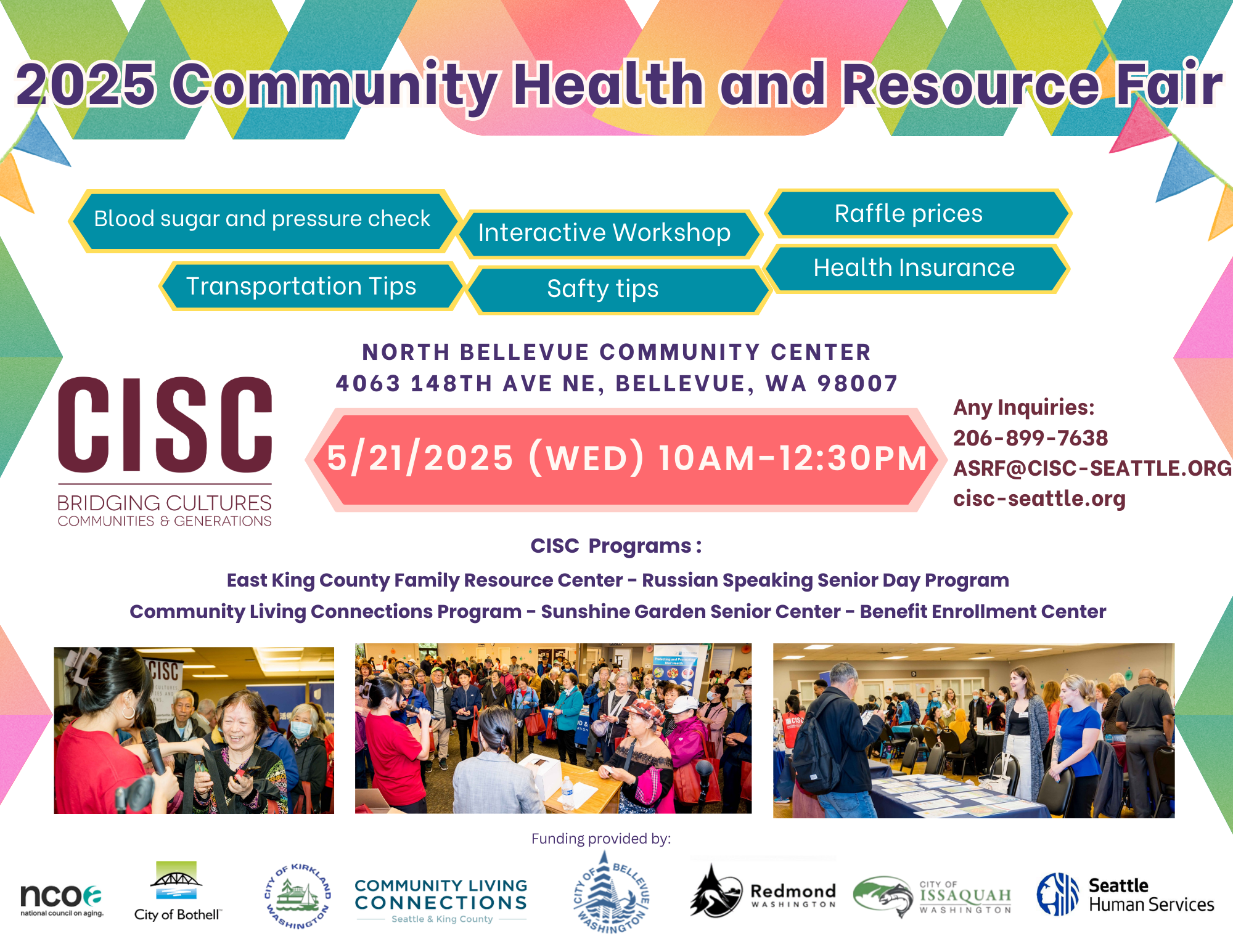 The 2025 CISC Community Health and Resource Fair will be held on Wednesday, May 21 from 10am – 12:30pm at the North Bellevue Community Center. Every year, our resource fair brings more than 300 community members together and connects them to a wide variety of community resources and services that support their needs, such as: